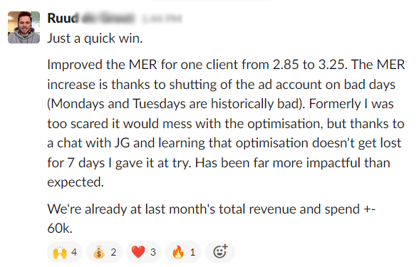 The best part is learning new tips and tricks like shutting off ads on historically bad days to save spend.